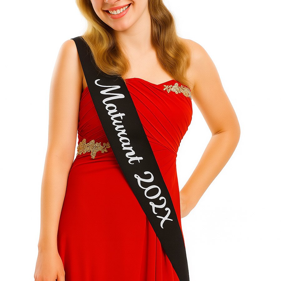 Černé maturitní šerpy / absolventské šerpy / šerpy pro předškoláky / šerpy na rozlučku se svobodou vyrobené z taftové stuhy české výroby o šířce 10,8 cm a délce standardně 2 m (délka vhodná pro většinu maturantů a dospělých). Pro prostorově výraznější osoby můžete objednat šerpy v délce 2,2 nebo 2,4 m a nebo pro děti a předškoláky v délce 1,4 nebo 1,6 m, případně pro větší děti o délce 1,8 m.
