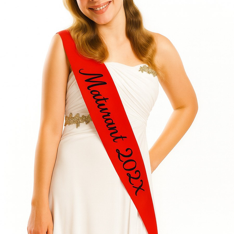 Červené maturitní šerpy / absolventské šerpy / šerpy pro předškoláky / šerpy na rozlučku se svobodou vyrobené z taftové stuhy české výroby o šířce 10,8 cm a délce standardně 2 m (délka vhodná pro většinu maturantů a dospělých). Pro prostorově výraznější osoby můžete objednat šerpy v délce 2,2 nebo 2,4 m a nebo pro děti a předškoláky v délce 1,4 nebo 1,6 m, případně pro větší děti o délce 1,8 m.