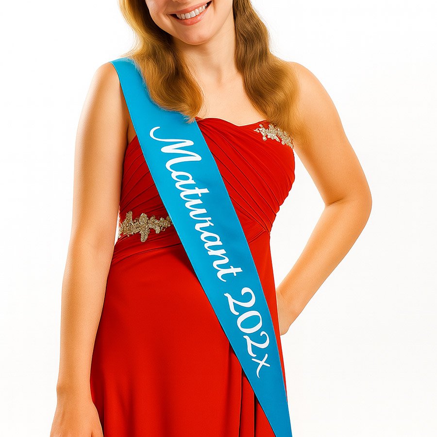 Tyrkysové maturitní šerpy / absolventské šerpy / šerpy pro předškoláky / šerpy na rozlučku se svobodou vyrobené z taftové stuhy české výroby o šířce 10,8 cm a délce standardně 2 m (délka vhodná pro většinu maturantů a dospělých). Pro prostorově výraznější osoby můžete objednat šerpy v délce 2,2 nebo 2,4 m a nebo pro děti a předškoláky v délce 1,4 nebo 1,6 m, případně pro větší děti o délce 1,8 m.